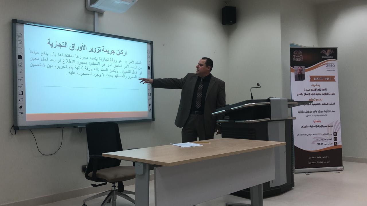 نظمت كلية إدارة الأعمال بالخرج محاضرة علمية بعنوان "جريمة تزوير الأوراق التجارية والمالية وعقوبتهما القانونية"، وذلك بتاريخ الثلاثاء 19/7/1440 هـ الموافق 26/3/2019م، قدم لها سعادة الدكتور/ عبدالله ماجد العكايلة الأستاذ المشارك بقسم القانون. تناولت المحاضرة مفهوم جريمة التزوير، وتعريف الأوراق التجارية والمالية، وأشكالهما المختلفة، ثم أنواع جرائم التزوير، كما بين المحاضر أن أهمية هذا الموضوع تكمن في كون النظام الجزائي لجرائم التزوير في المملكة الصادر بموجب المرسوم الملكي رقم م / 11 وتاريخ 18/2/1435 هـ نص في المادة ``13`` على أن تزوير الأوراق التجارية والمالية من الصور المشددة التى يستحق مرتكبها أشد العقوبات المقررة في ذلك النظام، وذلك لكون الحماية الجنائية للأوراق التجارية مبنية على حماية ضرورة من الضرورات الخمس التي جاءت الشريعة الإسلامية بحفظها من أي اعتداء قد يقع عليها، وهذه الضرورة هي ضرورة حفظ المال. كما تناول المحاضر الأركان الأساسية لجريمة تزوير الأوراق التجارية وألية الحماية منها .
