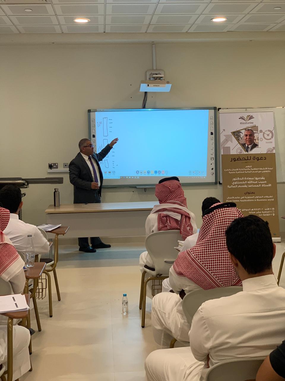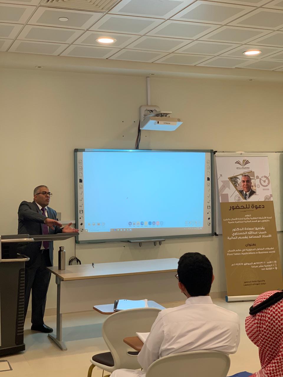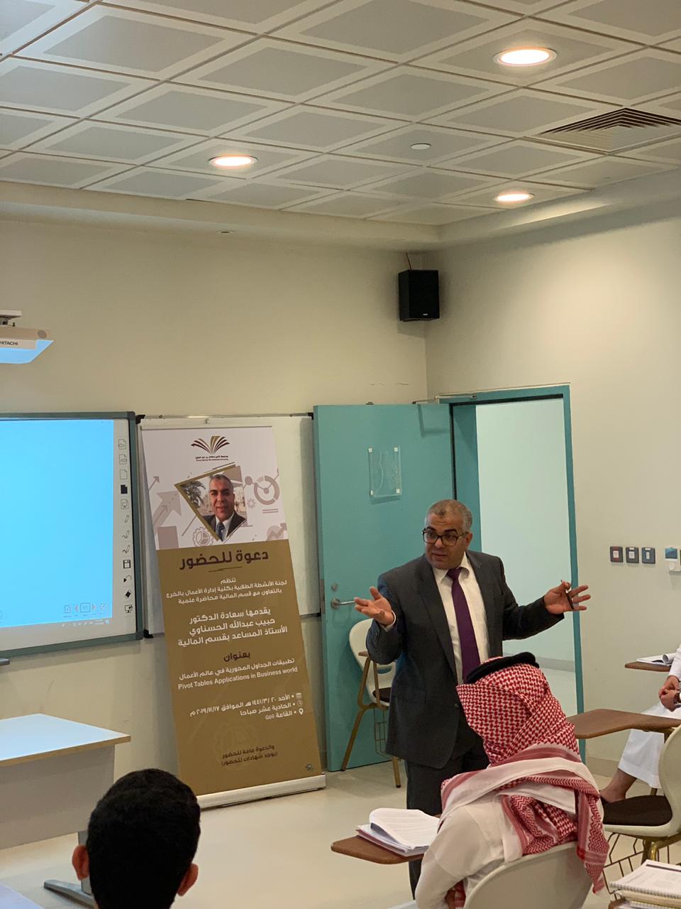 نظمت لجنة الأنشطة الطلابية بكلية إدارة الأعمال بالخرج بالتعاون مع قسم المالية محاضرة علمية بتاريخ 17 نوفمبر 2019 بعنوان "تطبيقات الجداول المحورية في عالم الأعمال"، قدمها سعادة الدكتور/ الحبيب عبد الله الحسناوي الأستاذ المساعد بقسم المالية، حيث أشار فيها إلى ضرورة تمكين طلاب إدارة الأعمال من آليات معالجة المعلومات في عالم يتسم بالتدفق السريع للمعلومات وذلك لدعم الطلاب في أخذ القرارات المناسبة. إثر ذلك، قدم المحاضر الجداول المحورية وأبرز تطبيقاتها في إدارة الأعمال، و كذلك قدم بعض الأمثلة التي ترتبط بالتسويق وبالموارد البشرية وبالمالية وبالمحاسبة. وفي ختام مداخلته، قدم المحاضر تطبيقا عمليا يتعلق بأداء الأسهم المدرجة في السوق المالية وذلك باستخدام الجداول المحورية، كما قدم أيضاً بعض المواقع على الشبكة العنكبوتية للمزيد من الشرح والتوضيح.