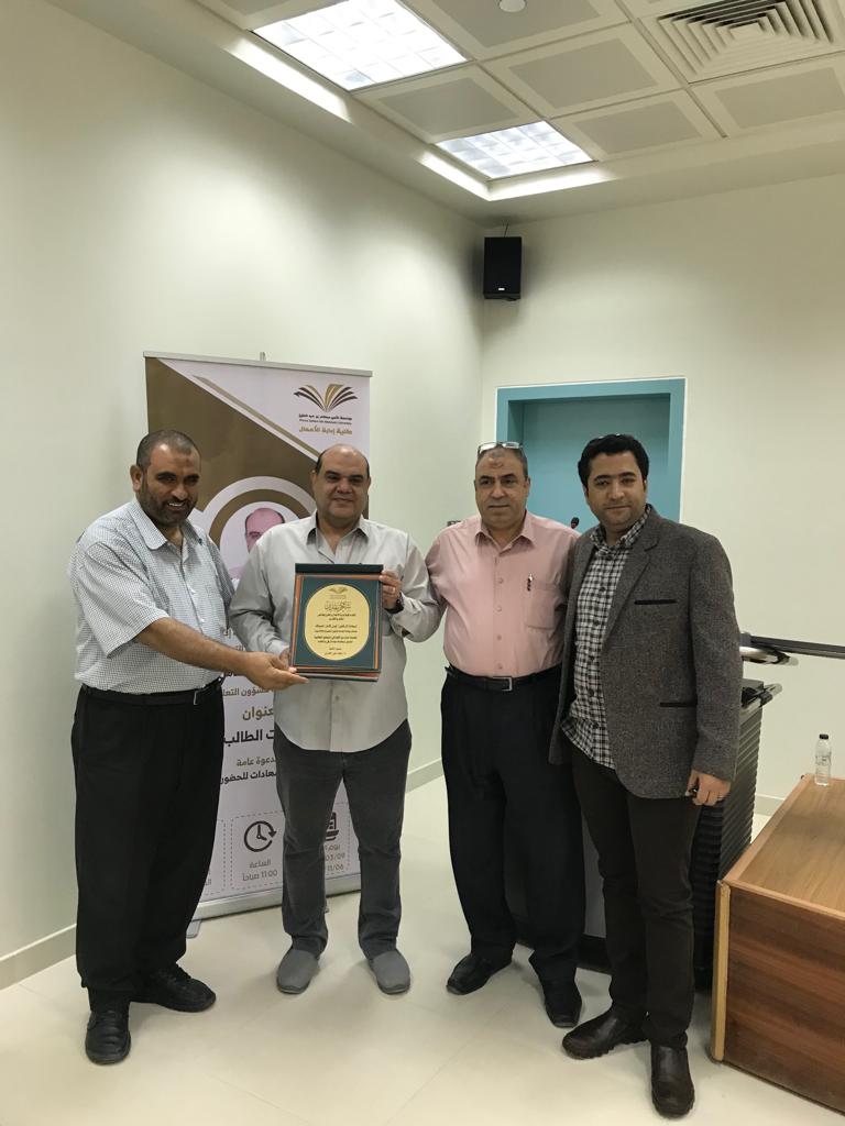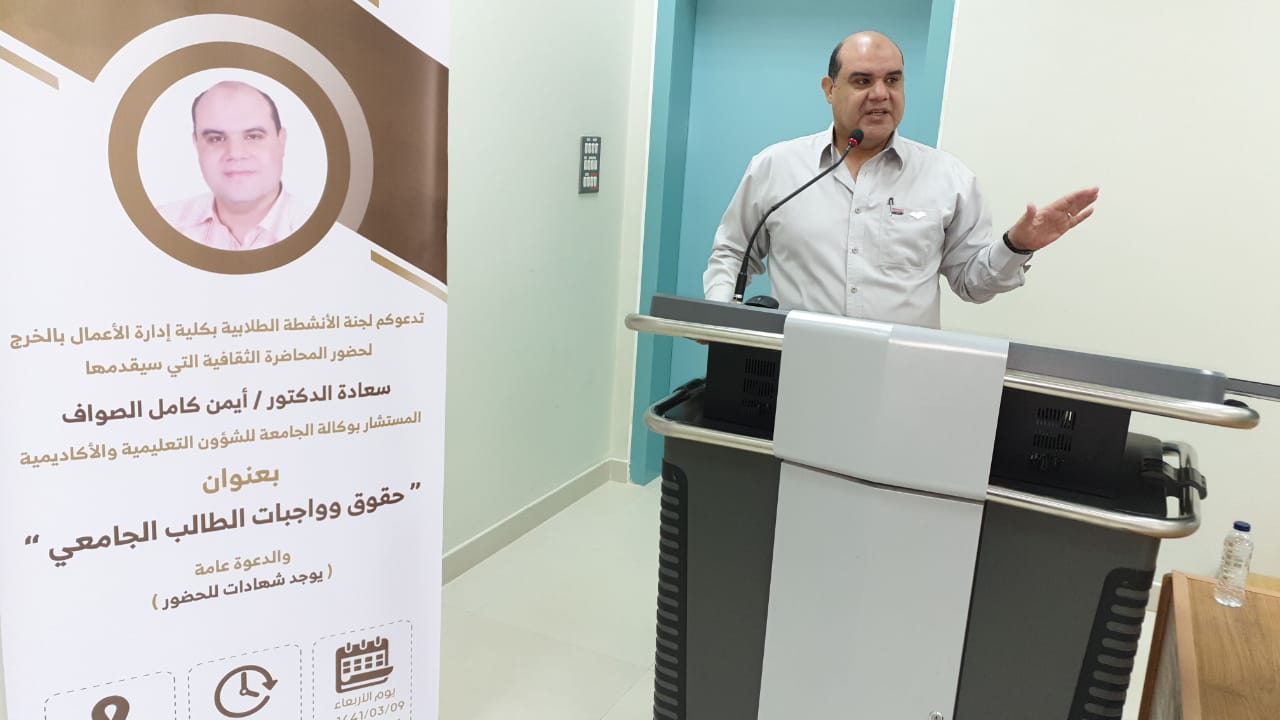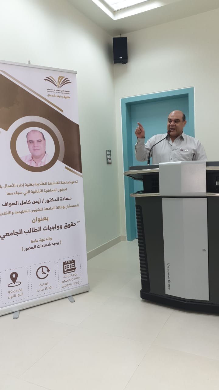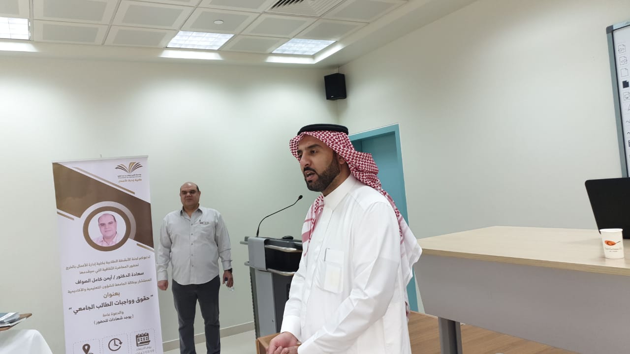 تحت رعاية سعادة عميد الكلية الدكتور/ عواد بن على الوثيري، نظمت لجنة الأنشطة الطلابية بكلية إدارة الأعمال بالخرج بتاريخ الأربعاء 6/11/2019 م محاضرة ثقافية بعنوان "حقوق وواجبات الطالب الجامعى"، قدمها سعادة الدكتور/ أيمن كامل الصواف المستشار لدى وكالة الجامعة للشؤون التعليمية والأكاديمية والذى تناول فيها حقوق وواجبات الطالب الجامعي، حيث استعرض سعادته مفهوم وأهداف وأركان الإرشاد الأكاديمي، والجدول الدراسى، وآلية حساب المعدل الفصلى والتراكمي للطالب، كما تناول أيضاً عدداً من القضايا الأكاديمية التي تهم الطالب الجامعي مثل العبء الدراسي، والمعدل الفصلي، والمعدل الأكاديمي، والاختبارات البديلة والحرمان، والإعتذاروالتأجيل، والفصل الأكاديمي وضوابطه، مؤكداً على ضرورة تحقيق الطالب التوازن بين حقوقه التي يتمتع بها وواجباته نحو الجامعة من احترام الزي، و حضور المحاضرات في وقتها المحدد، مع التزامه أيضاً بالأنظمة والقوانين الجامعية، وفي نهاية المحاضرة أجاب سعادته على أسئلة واستفسارات الطلاب .وفي نهاية المحاضرة قدم سعادة الدكتور/ محمد محيا رئيس قسم الموارد البشرية بالكلية الذي حضر نائباً عن سعادة عميد الكلية شكره وتقديره لسعادة الدكتور أيمن الصواف ثم قدم الدكتور/ طارق الخطيب رئيس لجنة الأنشطة الطلابية بالكلية شكره وتقديره أيضاً لسعادة الدكتور أيمن الصواف على حضوره وتلبيته للدعوة كما قدم شكره أيضاً للطلاب وأعضاء هيئة التدريس الذين شاركوا في الحضور والتفاعل.