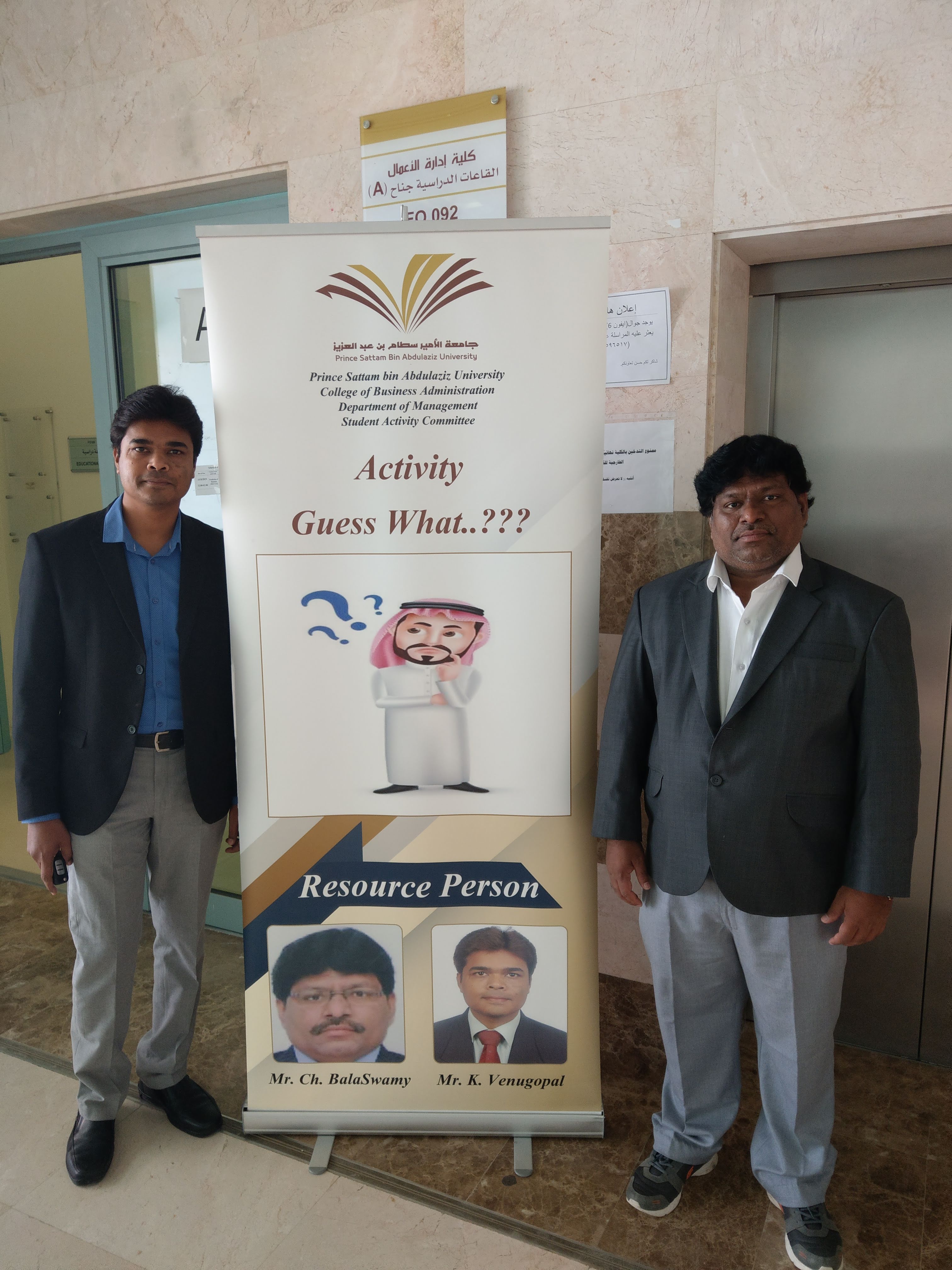إستمرا لأنشطة لجنة الأنشطة الطلابية بكلية إدارة الاعمال، نظمت اللجنة بتاريخ الاثنين 16/2/1441هـ مسابقة بعنوان "Guess What"، وهي نشاط ترفيهي ذهني يهدف الى تنمية واختبار قدرات التفكير الإيجابى لدى الطلاب، حيث شارك في المسابقة عدد من الطلاب تم تقسيمهم الى خمس فرق وبعدها تم البدء بتطبيق الاختبار والاسئلة على هذه الفرق وبعد عدد من الجولات فاز فريق الطالب/ عبد العزيز.، الجدير بالذكر ان هذا اول نشاط ترفيهي تنظمه لجنة الأنشطة هذا العام حتى تحقق اهداف الأنشطة بشكل عام وتنوع هذه الأنشطة لتعزيز وتنمية مهارات وقدرات طلاب الكلية.