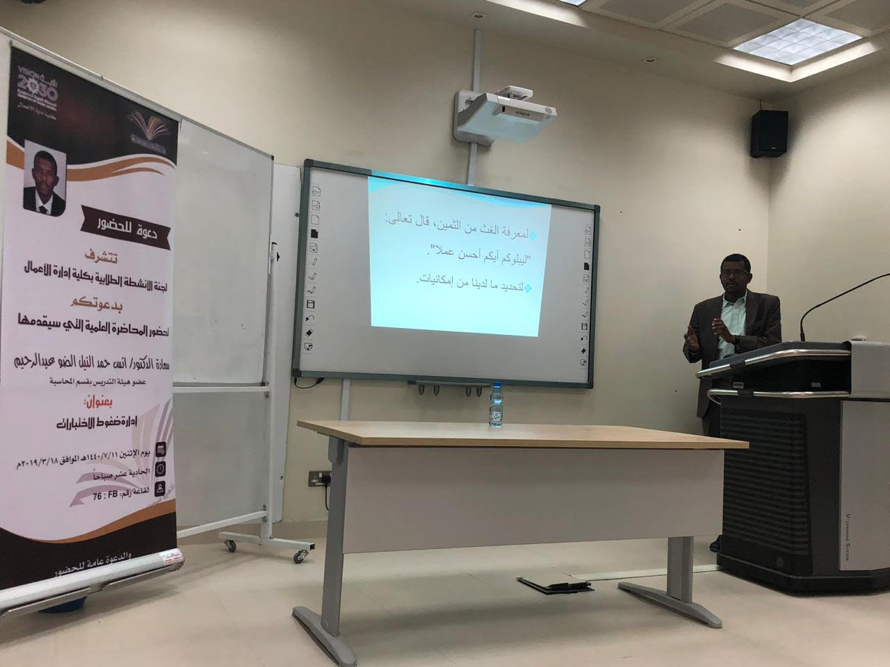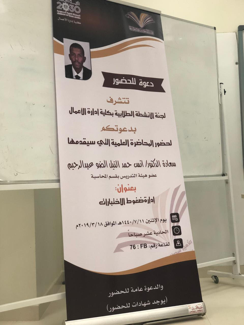 نظمت لجنة الأنشطة الطلابية بكلية إدارة الأعمال بالخرج بتاريخ الاثنين 11/7/1440 هـ الموافق 18/3/2019م ورشة عمل بعنوان "إدارة ضغوط الاختبارات"، والتى قام بإداراتها سعادة الدكتور/ أنس حمد النيل الضو عبدالرحيم عضو هيئة التدريس بكلية إدارة الأعمال، والتى تناول فيها عدة محاور من بينها مصار الضغوط والتوتر لدى الطلاب خلال فترة الاختبارات ، والأعراض والتداعيات الناتجة عن ذلك، كما استعرض أيضاً كيفية تحقيق الإدارة المثلي لضغوط الاختبارات واجتيازها حتى لا تؤثر سلباً على معدلات الطالب و تفوقه الدراسي، وفي نهاية الورشة تناول الدكتور/ الضو بعض الطرق التي يمكن اتباعها للتعامل الجيد مع فترة الامتحانات بضغوطها واكتئابها الذي يتعرض له الطلاب خلالها، من بينها التحفيز والدافعية، مع الحفاظ على نظام حياتي صحي ، مع الحرص على التنظيم الجديد وإدارة الوقت مع تنمية الشعور الإيجابى لدى الفرد لاجتياز صعوبات هذه الفترة.
