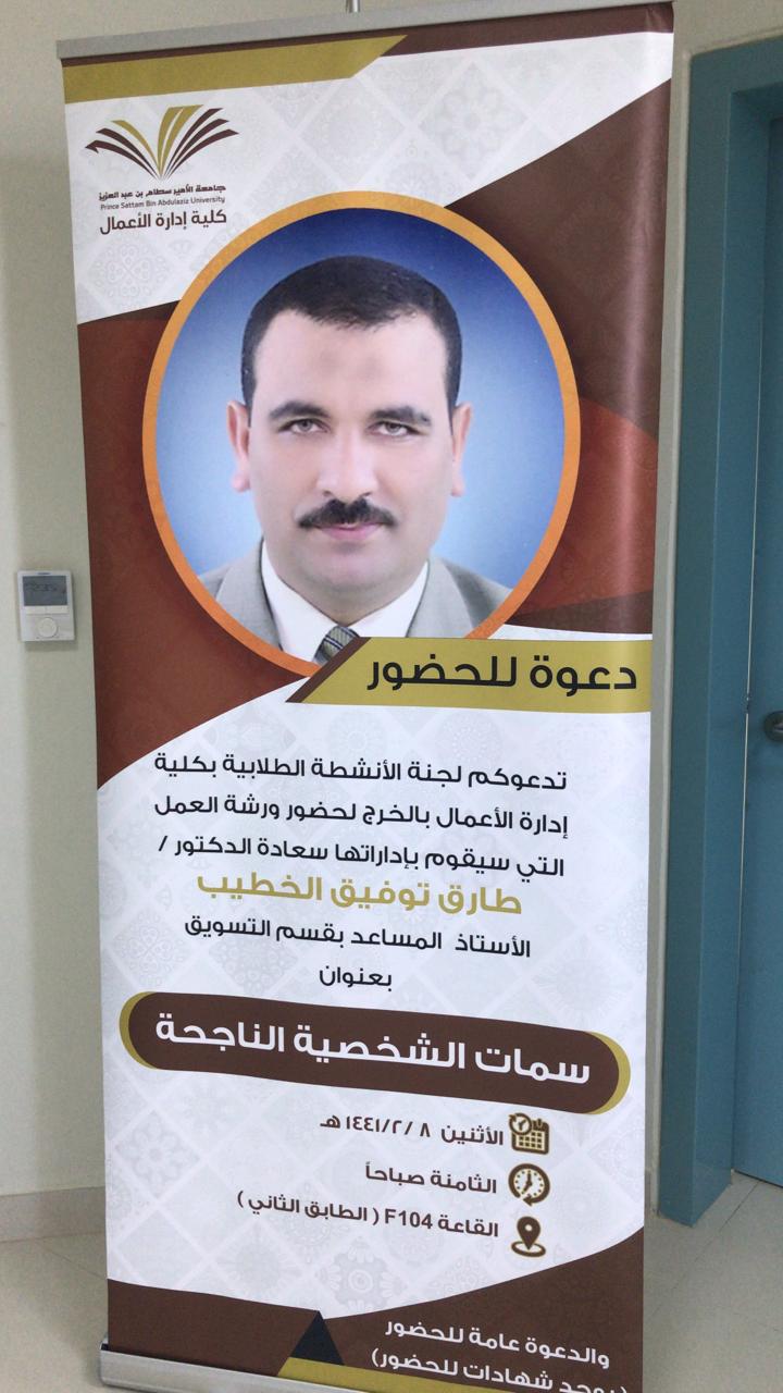 نظمت لجنة الانشطة الطلابية بكلية إدارة الاعمال بتاريخ الاثنين 8/2/1441هـ ورشة عمل بعنوان "سمات الشخصية الناجحة" والتي تندرج ضمن خطة اللجنة للأنشطة الطلابية لهذا العام، حيث قام سعادة الدكتور/ طارق توفيق الخطيب رئيس اللجنة الطلابية بتنفيذ الورشة، واستهل ورشته بالترحيب بالطلاب متمنيا لهم التوفيق والنجاح في دراستهم وحياتهم الجامعية، واستعرض بعد ذلك محاور الورشة والتي تضمنت العديد من المحاور الفرعية، وأهمها السعي للتميز والتخطيط وتحديد الأهداف والتركيز والتفكير الايجابي وغيرها من المحاور والتي ابرز خلالها سعادة الدكتور اهم النقاط التي يجب ان يتحلى بها الشخص حتى يبني شخصية متميزة في جميع مجالات الحياة. . الجدير بالذكر ان الورشة تهدف الى تعريف الطلاب بأهم السمات التي يجب ان يتميز بها الشخص بالإضافة الى العديد من النصائح والارشادات التي سعى الدكتور/ الخطيب الى اثراء ورشته بها. وفي نهاية الورشة تمني للحضور التميز والتفوق وأن يكونوا جميعا أصحاب سمات شخصية متميزة.