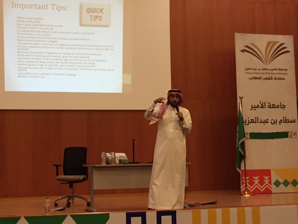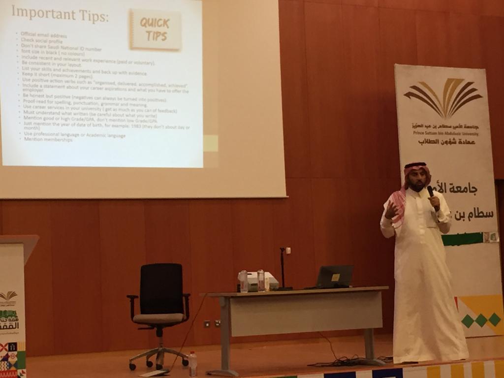 استمراراً لجهود كلية إدارة الأعمال بالخرج في تأهيل طلابها للتنافس في سوق العمل وإثبات جدارتهم، أقامت وحدة الخريجين ورشة عمل في مجال التأهيل الوظيفي لطلاب كلية ادارة الأعمال والتي كانت بعنوان "مهارات البحث عن عمل"، والتي قام بتقديمها سعادة الدكتور/ محمد المحيا رئيس قسم إدارة الموارد البشرية. تناولت الورشة بعض الإرشادات والتوجيهات التي تمكن الطالب من اكتساب خبرات وقدرات لحديثي التخرج للحصول على فرصة عمل والتي منها حضور الدورات التدريبية والعمل التطوعي والعمل الجزئي. ولقد تناول الدكتور المحيا عدد من المحاور الأخرى التي تهم الطلاب المتخرجين حديثا والتي تشمل التميز في بناء السيرة الذاتية المؤهله للمقابلة الشخصية, وتم تقديم توجيهات قيمة في بناء السيرة الذاتية. كما شملت الورشة بعض التوجيهات لتحقيق الكفاءة في المقابلات الشخصية والظهور بشكل ايجابي. وقد كان للجانب التقني دور هام في هذه الورشة حيث تم التعريف بأبرز البوابات الإلكترونية الموجهه للباحثين عن الوظائف، والتعريف بالبرامج التوظيفية الوطنية كبرنامج طاقات وبرنامج تمهير. كما دعا الدكتور المحيا الحضور إلى الاستفادة من خبرات أعضاء هيئة التدريس بالكلية لتوجيههم إلى أفضل الاحتمالات الممكنة لبناء السيرة الذاتية وتجاوز المقابلات الشخصية وكذلك بما يتعلق بالشهادات المهنية في التخصص الجامعي والتى لها الدور في تمييز الخريجين عن غيرهم.وقد شهدت تلك الورشة حضور عدد من الطلاب حيث لاقت إستحساناً كبيراً منهم. الجدير بالذكر أن وحدة الخريجين تقدم الآن سلسلة من الدورات وورش العمل التدريبية بهدف تطوير وتأهيل الطلاب الخريجين والمتوقع تخرجهم في مجالات مختلفة منها ما يتعلق بمجال التأهيل الوظيفي، والتدريب المهني. وتدعوا وحدة الخريجين الطلاب بضرورة الحضور والإستفادة من تلك الدورات لما تقدمه لهم من نفع وصقل لمهاراتهم.