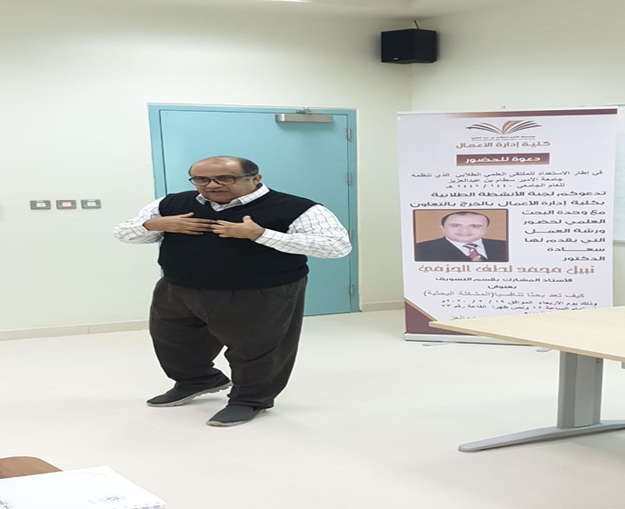 في إطار التحضير للملتقى العلمي الطلابي للعام الجامعي 1440/1441هـ الذي تنظمه جامعة الأمير سطام بن عبدالعزيز، نظمت لجنة الأنشطة الطلابية بكلية إدارة الأعمال بالخرج بتاريخ الأربعاء 25/6/1441هـ الموافق 19/2/2020 م ورشة عمل بعنوان "كيف تعد بحثا علميا تنافسيا "، قدمها سعادة الدكتور/ نبيل محمد لطف الحزمي الاستاذ المشارك بقسم التسويق بالكلية, وذلك بحضور عدد من السادة أعضاء هيئة التدريس بالكلية. تناولت الورشة عدة جوانب، منها الدوافع التى تحث الباحث على إختيار موضوع البحث، وكيفية صياغة مشكلة البحث وأهدافه وأهميته وفرضياته، ومناهج البحث العلمى وأدواته.