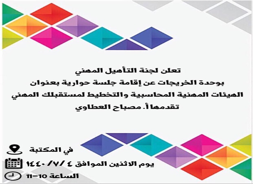 نظمت لجنة التأهيل الوظيفى بوحدة الخريجات بكلية إدارة الأعمال جلسة حوارية بعنوان "الهيئات المهنية المحاسبية و التخطيط لمستقبلك المهنى"، قدمتها أ. مصباح ياسر العطاوي، و ذلك يوم الاثنين الموافق 1440/7/4 هـ ، بحضور العديد من طالبات قسم المحاسبة، حيث تناولت عدة محاور: المحور الأول تضمن التعريف بالهيئة السعودية للمحاسبين القانونيين و أهم برامجها ،ولجانها ومهامها، والتعريف بالجمعية السعودية للمراجعين الداخليين ومهامها، وتناول المحور الثاني كيفية التخطيط للمستقبل المهنى المحاسبي من خلال تحديد الهدف الوظيفي وأهم متطلبات الحصول عليه والمشكلات التي تعيق الوصول له والحلول الممكنة، والمحور الأخير ركز على فرص العمل المتاحة لخريجات التخصص في المستقبل.