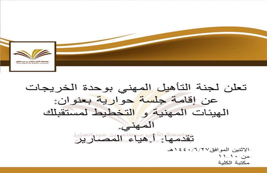 نظمت لجنة التأهيل الوظيفي بوحدة الخريجات بكلية إدارة الأعمال بإشراف أ. هياء المصارير جلسة حوارية بعنوان" الهيئات المهنية و التخطيط لمستقبلك المهني"، و ذلك فى يوم الاثنين الموافق 1440/6/27 هـ، بحضور العديد من طالبات قسم القانون، حيث تناولت الجلسة عدة محاور: المحور الأول تعلق بالتعريف بالهيئة السعودية للمحامين و أهم برامجها ،ولجان المجتمع القانوني وصلاحياته، وتناول المحور الثانى كيفية التخطيط للمستقبل المهنى القانونى من خلال تحديد الهدف الوظيفي وأهم متطلبات الحصول عليه والمشكلات التي تعيق الوصول له والحلول الممكنة، وتناول المحور الأخير فرص العمل المتاحة لخريجات التخصص في المستقبل.