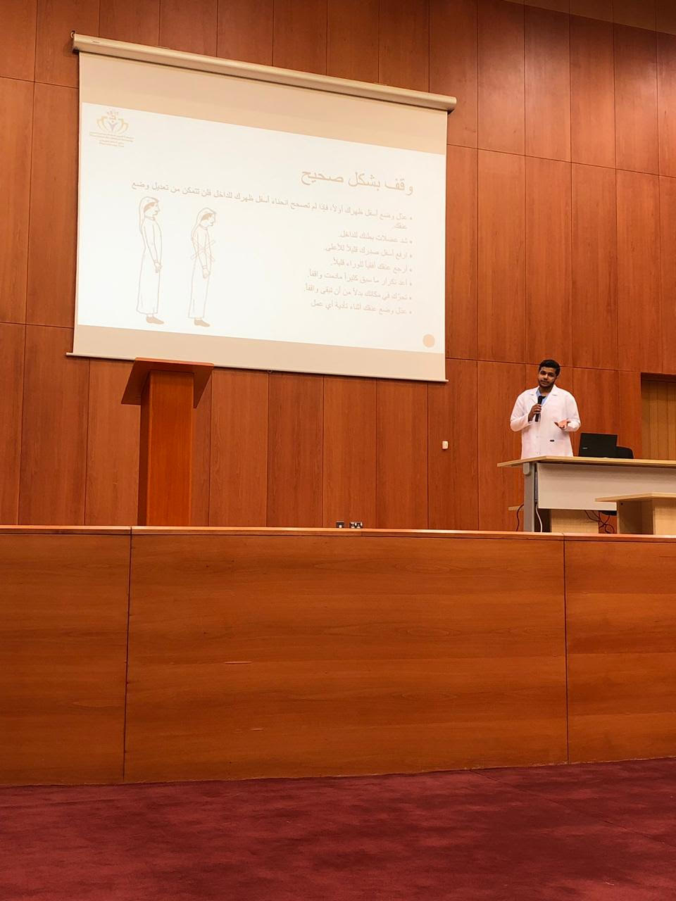 تحت إشراف عمادة شؤون الطلاب، وفي إطار تفعيل خطته التشغيلية، استقبل يوم الأربعاء 29/6/1440 هـ الموافق 6/3/2019 م نادي عدالة التابع لقسم القانون بكلية إدارة الأعمال بالخرج، نظيره من كلية العلوم الطبية التطبيقية الذي أعطى محاضرة لفائدة طلاب كلية إدارة الأعمال في موضوع (عدل ظهرك). وقد تولى استعراض محاور المحاضرة الطالب أحمد العيسي، والذي قدم فكرة عامة عن الأمراض التي تصيب الظهر وأسبابها المباشرة وغير المباشرة، وفي مقدمتها عدم الاعتدال فى الحركات من جلوس ونوم وكذلك عن عدم الحرص على جودة معدات الجلوس والنوم من مراتب وأسرة ووسائد وغيرها. مما يضاعف من نسب الإصابة بأمراض التآكل التي قد تصيب الغضروف الظهري. بعد ذلك انتقل المحاضر إلى استعراض بعض وسائل الوقاية والعلاج. وفي نهاية اللقاء، أخذ الكلمة رئيس قسم القانون الدكتور الحسن أبكاس الذي شكر من خلالها كل منتسبي نادي العلاج الطبيعي ومن خلاله كل طلاب كلية العلوم الطبية التطبيقية مؤكدا على أهمية مثل هذا التبادل المعرفي بين طلاب الكليات والجامعات المختلفة لما في ذلك من أهمية بالغة للبناء السليم لشخصية الطالب الجامعي، ثم قدم سعادته درعا تذكاريا شكرا وعرفانا على المبادرة المحمودة متمنيا للنادي دوام التألق والعطاء.