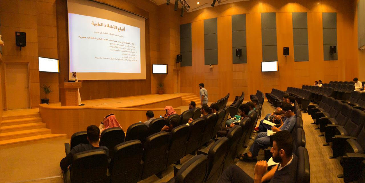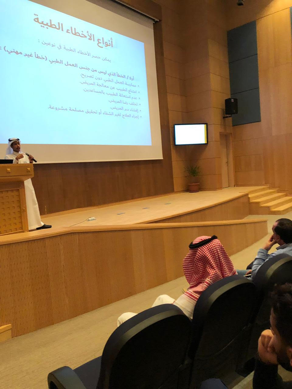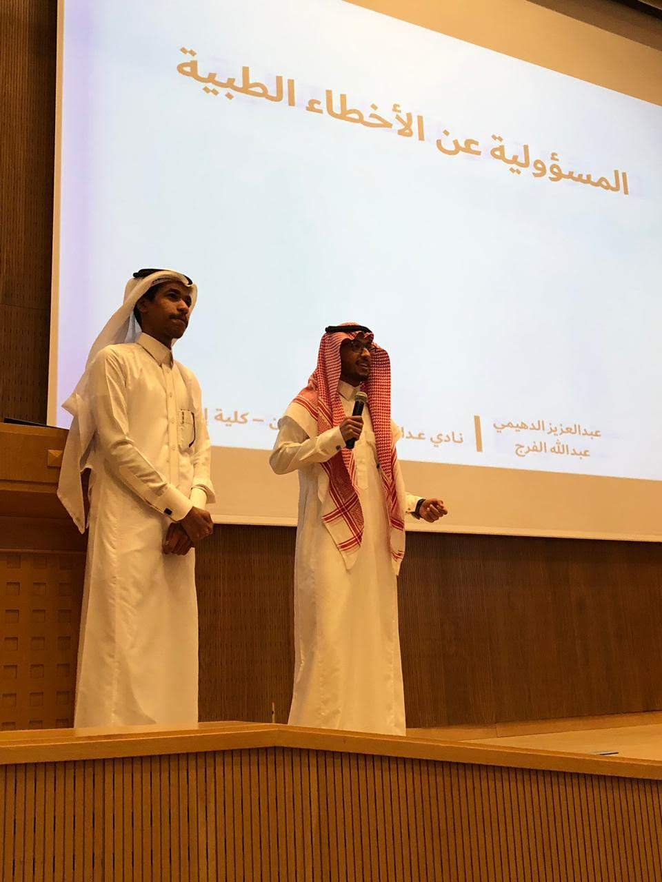 قام نادي عدالة بكلية إدارة الأعمال بالخرج بتاريخ الاثنين 4/7/1440هـ الموافق 11/3/2019م بزيارة إلى نادي العلاج الطبيعي بكلية العلوم الطبية التطبيقية بالمدينة الجامعية بالخرج، وفي إطار التعاون العلمى المشترك بين الناديان التابعان لعمادة شئون الطلاب، تم تنظيم محاضرة علمية بعنوان "على من تقع مسؤولية الأخطاء الطبية ؟". تطرق من خلالها الطالبان عبد العزيز الدهيمي و عبد الله الفرج إلى مفهوم المسؤولية والمسؤولية المجتمعية وأنواع الأخطاء الطبية التي قد يقع فيها الطبيب والممارس الصحى وعلى من تقع هذه المسؤولية، كما إستعرض الطالبان أنواع المسؤولية والواجبات المناط بكل فرد يعمل في القطاع الطبي تحملها، و قد كرم رئيس نادي العلاج الطبيعي أعضاء نادي عدالة على ما قدموه من مادة علمية كما دعاهم إلى القيام بجولة في أنحاء مركز العلاج الطبيعي المعد لتدريب الطلاب.