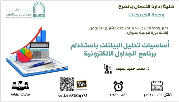 نظمت وحدة الخريجات بالكلية يوم الاثنين 30-يناير-2023م ورشة عمل للطالبات عن اساسيات تحليل البيانات باستخدام برنامج الجداول الالكترونية، قدمها سعادة الدكتور محمد حميد عفيف الاستاذ المساعد بقسم نظم المعلومات الإدارية. تم خلال الورشة استعراض اهم المفاهيم والمصطلحات المتعلقة بتحليل البيانات، وطرق جمعها، وكيفية تهيئتها للتحليل، واستخلاص اهم المؤشرات التي تحويها تلك البيانات، وكذلك تم التطرق الى اهم الأدوات التي يتضمنها برنامج الجداول الالكترونية في تحليل البيانات. تخلل الورشة العديد من المداخلات والتساؤلات من قبل الطالبات التي أثرت الورشة.