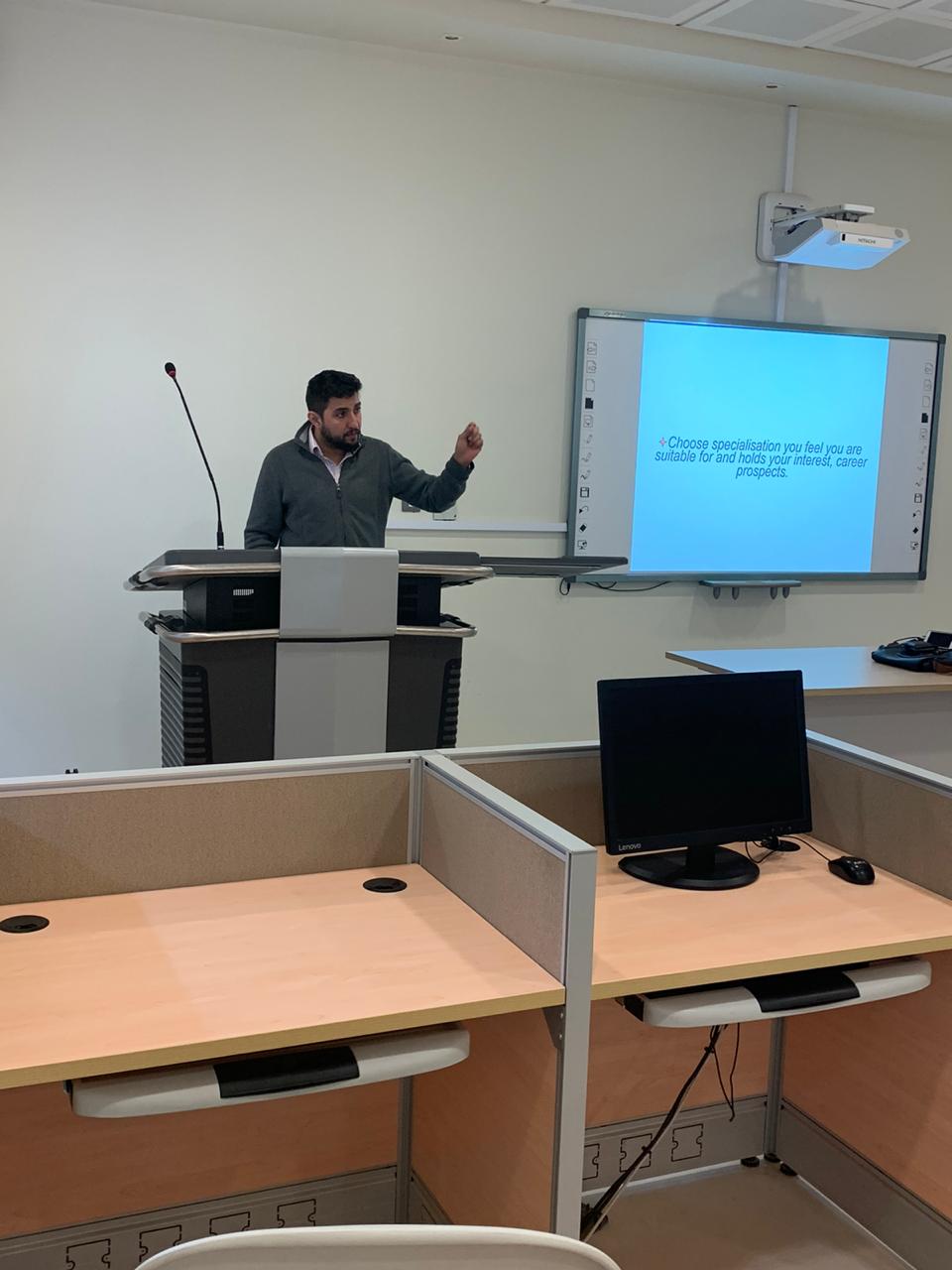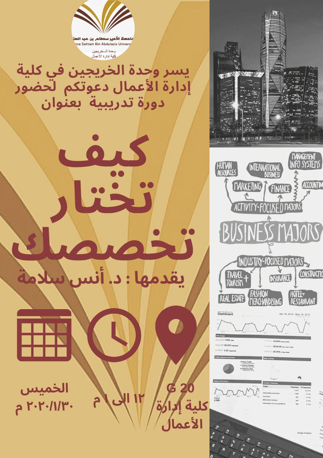 نظمت وحدة الخريجين بكلية إدارة الأعمال يوم الخميس الموافق 30/1/2020 م دورة تدريبية بعنوان "كيف تختار تخصصك؟" والتي قام بتقديمها سعادة الدكتور أنس سلامة، عضو هيئة التدريس بقسم نظم المعلومات الإدارية. وقد تناولت الدورة بعض الخطوات التي يمكن اتباعها لاختيار التخصص الجامعي المناسب, كما تناولت الدورة أيضا التركيز على بعض النقاط المهمة للوصول إلى التخصص المناسب الذي يقود الطالب إلى مهنة حياته. وقد كان لمشاركة مقدم الدورة لتجربته في اختيار التخصص المناسب له دور هام في توضيح أهمية إختيار التخصص المناسب، وفي الختام اتيحت الفرصة للجمهور لطرح الأسئلة وقد أجاب عليها الدكتور أنس مدعما إجاباته بالأمثلة المناسبة.وتؤكد وحدة الخريجين متمثلة بقسم التأهيل المهني على أهمية حضور دورات التأهيل المهني لجميع طلاب الكلية وللخريجين بصفة خاصة, وذلك لتزويدهم بالمعلومات والمهارات اللازمة لسوق العمل والتي ستمكنهم من اقتناص الفرص الوظيفية والتدريبية المطروحة بكل يسر وسهوله.