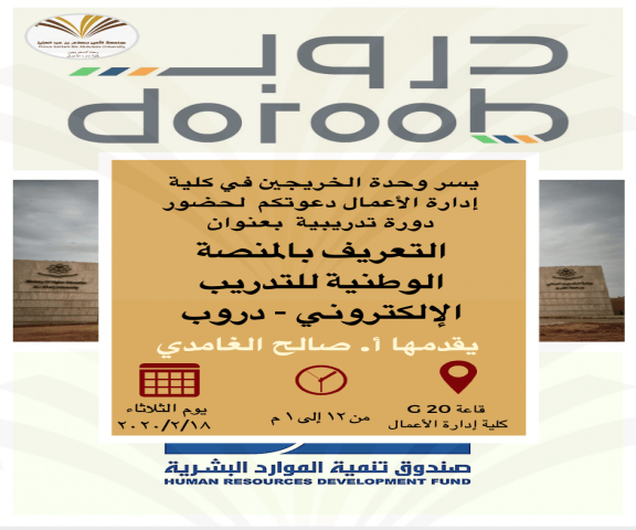 نظمت وحدة الخريجين بكلية إدارة الأعمال بتاريخ الثلاثاء 3/3/2020 ورشة عمل بعنوان "المنصة الوطنية للتدريب الإلكتروني - دروب". قدمها سعادة أ. صالح الغامدي، عضو هيئة التدريس بقسم نظم المعلومات الإدارية. هدفت الورشة إلى تعريف الطلاب بالمنصة الوطنية للتدريب الإلكتروني - دروب وما تقدمه من دورات تدريبية مجانية إلكترونية تستهدف طلاب وطالبات الجامعة حديثي التخرج في العديد من التخصصات كإدراة الأعمال، اللغات، التقنية وعلوم الحاسب، المهارات الوظيفية، وغيرها من التخصصات الأخرى, وذلك مما يعزز اكتساب المهارات التي تساهم في تحسين فرص المواطنين الوظيفية وتأهيلهم لسوق العمل. وقد وجه مقدم الورشة طلاب الجامعة لأهمية التسجيل والمشاركة في مثل هذه الدورات الإلكترونية مما يدعم فرصهم الوظيفية مستقبلاً في القطاع الحكومي والقطاع الخاص.شهدت الورشة حضور عدداً من الطلاب من مختلف التخصصات، وقد اتيحت الفرصة للتفاعل مع مقدم الورشة وتمت الإجابة على العديد من أسئلة الحضور.