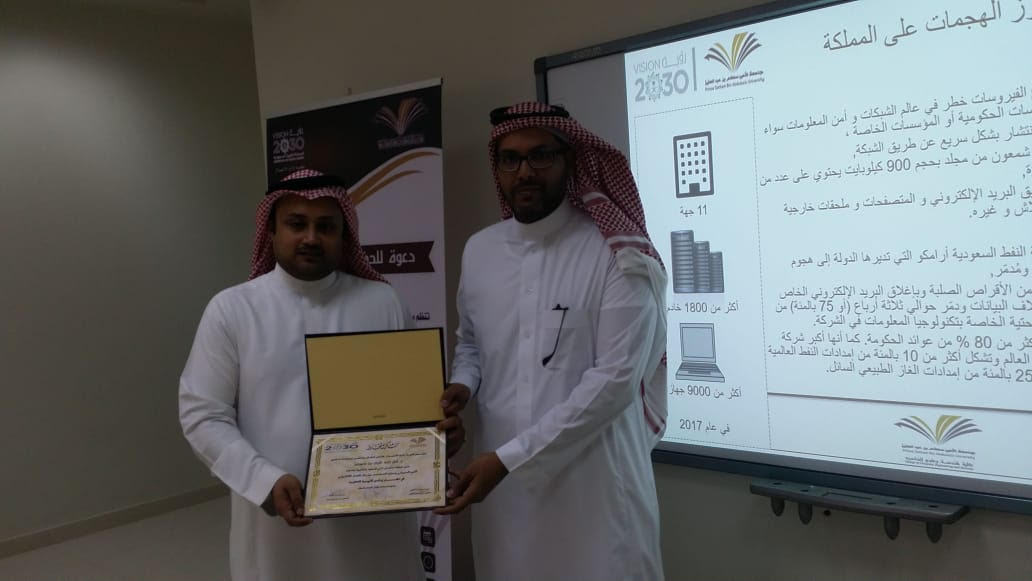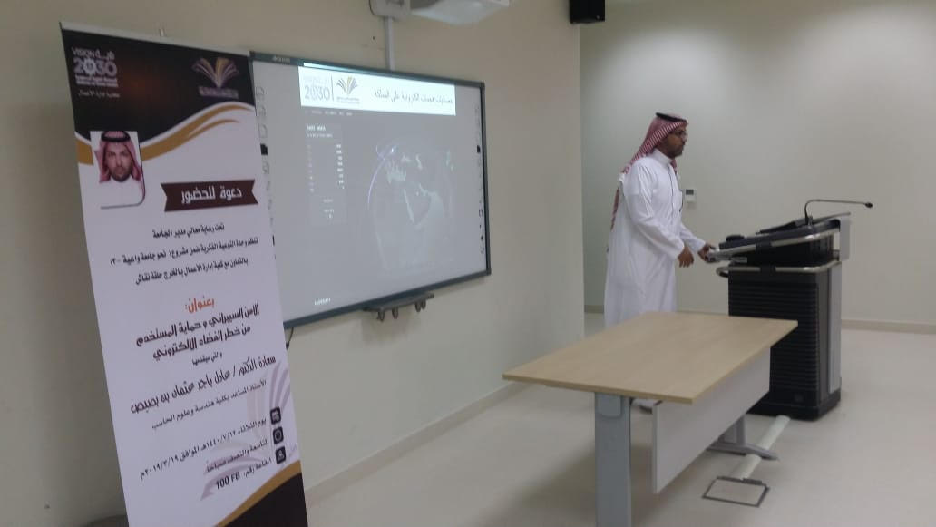 نظمت وحدة التوعية الفكرية بالتعاون مع كلية إدارة الأعمال بالخرج ضمن مشروع نحو جامعة واعية -3 حلقة نقاش بعنوان "الأمن السيبراني وحماية المستخدم من خطر الفضاء الالكتروني"، وذلك فى يوم الثلاثاء 12/7/1440 هـ الموافق 19/3/2019 م، قدمها سعادة الدكتور/ عادل باجد عثمان بصيص الأستاذ المساعد بكلية هندسة وعلوم الحاسب الآلى، حيث تناولت الحلقة عدداً من المحاور الرئيسة من بينها تعريف الأمن السيبراني باعتباره ممارسة حماية الأنظمة والشبكات والبرامج من الهجمات الرقمية التي تهدف إلى الوصول إلى المعلومات الحساسة أو تغييرها أو إتلافها أو ابتزاز المال من المستخدمين أو مقاطعة العمليات التجارية، كما تناولت الحلقة أيضاً المنهج الذي يستند عليه الأمن السيبراني الناجح الذى يتضمن طبقات متعددة للحماية في أجهزة الكمبيوتر أو الشبكات أو البرامج أو البيانات التي ينوي المرء الحفاظ على سلامتها، وأشار هنا إلى ضرورة أن يكمل المستخدمين والعمليات والتكنولوجيا بعضهم البعض ويتكاتفوا لإنشاء دفاع فعال من الهجمات السيبرانية، كما تناول الأسس التى يستند عليها الأمن السيبراني، وكذلك تطرق إلى الهيئات التي تدعم الأمن السيبراني. اختتمت الحلقة بصياغة آلية فعالة لحماية كافة المستخدمين من الابتزاز الالكتروني في ظل هذا الفضاء الالكتروني المترامي الأطراف.فى نهاية الورشة قدم سعادة عميد كلية إدارة الأعمال الدكتور/ أحمد بن سهيل عجينه شكره لسعادة الدكتور/ عادل بصيص على تلبية الدعوة وقدم لسعادته شهادة شكر وتقدير على دعمه للعمل الطلابى بكلية إدارة الأعمال.