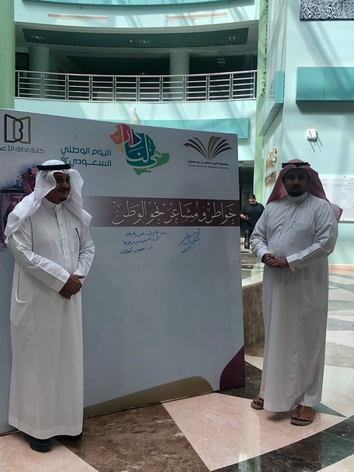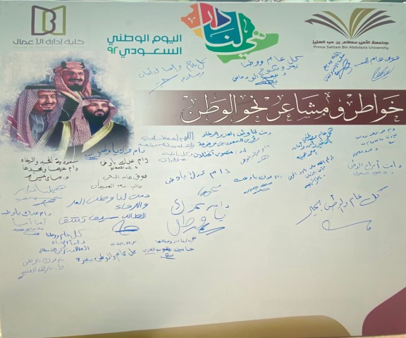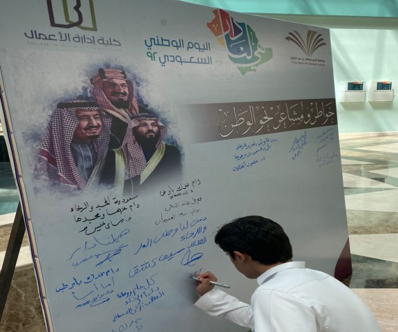 Under the patronage of His Excellency, the Dean of the College of Business Administration, Dr. Ahmed bin Suhail Ajina, and in the presence of the Vice-Deans of the College, the academic and administrative staff, and the students expressed their feeling towards the precious homeland on Sunday 29/2/1444 AH corresponding to 25/9/2022 AD. The expression of these feelings was filled with pride in this beloved homeland wishing continued security, wellbeing, prosperity and growth under the wise leadership of the Custodian of the Two Holy Mosques, King Salman bin Abdulaziz Al-Saud, and his faithful Crown Prince, may Allah guide and protect them all.